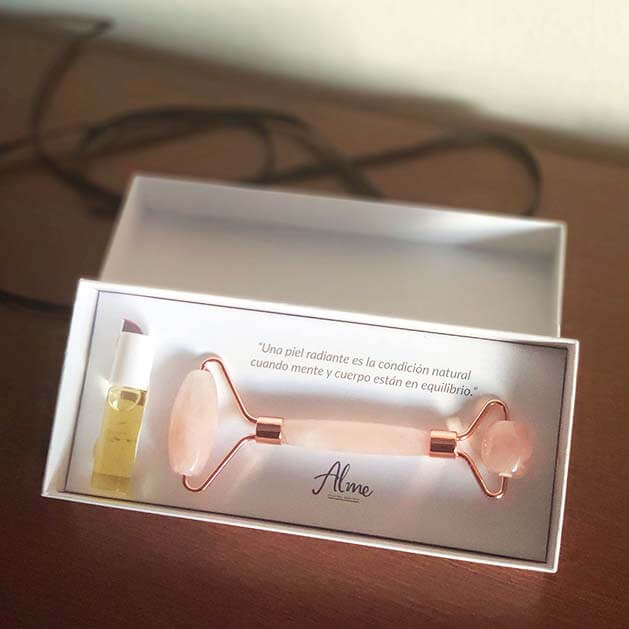 El estuche contiene: un rodillo facial de cuarzo rosa, un roll on de 5ml de Fascinating Golden Oil de Alme Organic, una bolsita para guardar el rodillo, instrucciones sobre como utilizar cada producto y la combinación de ambos.