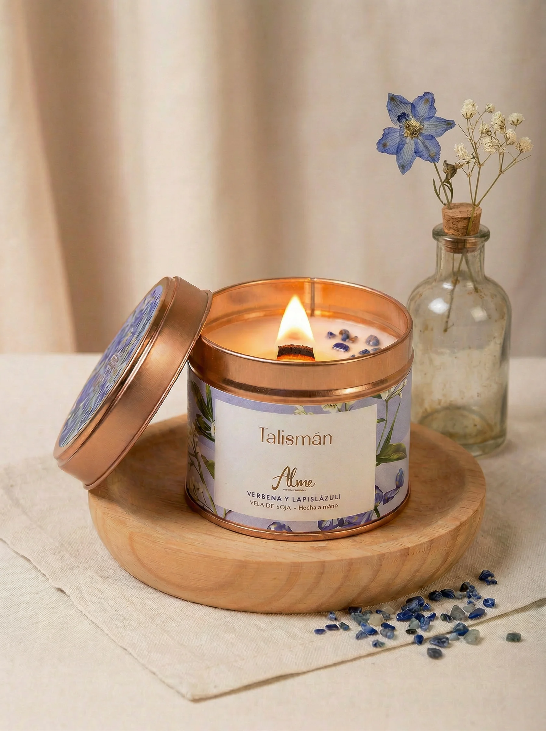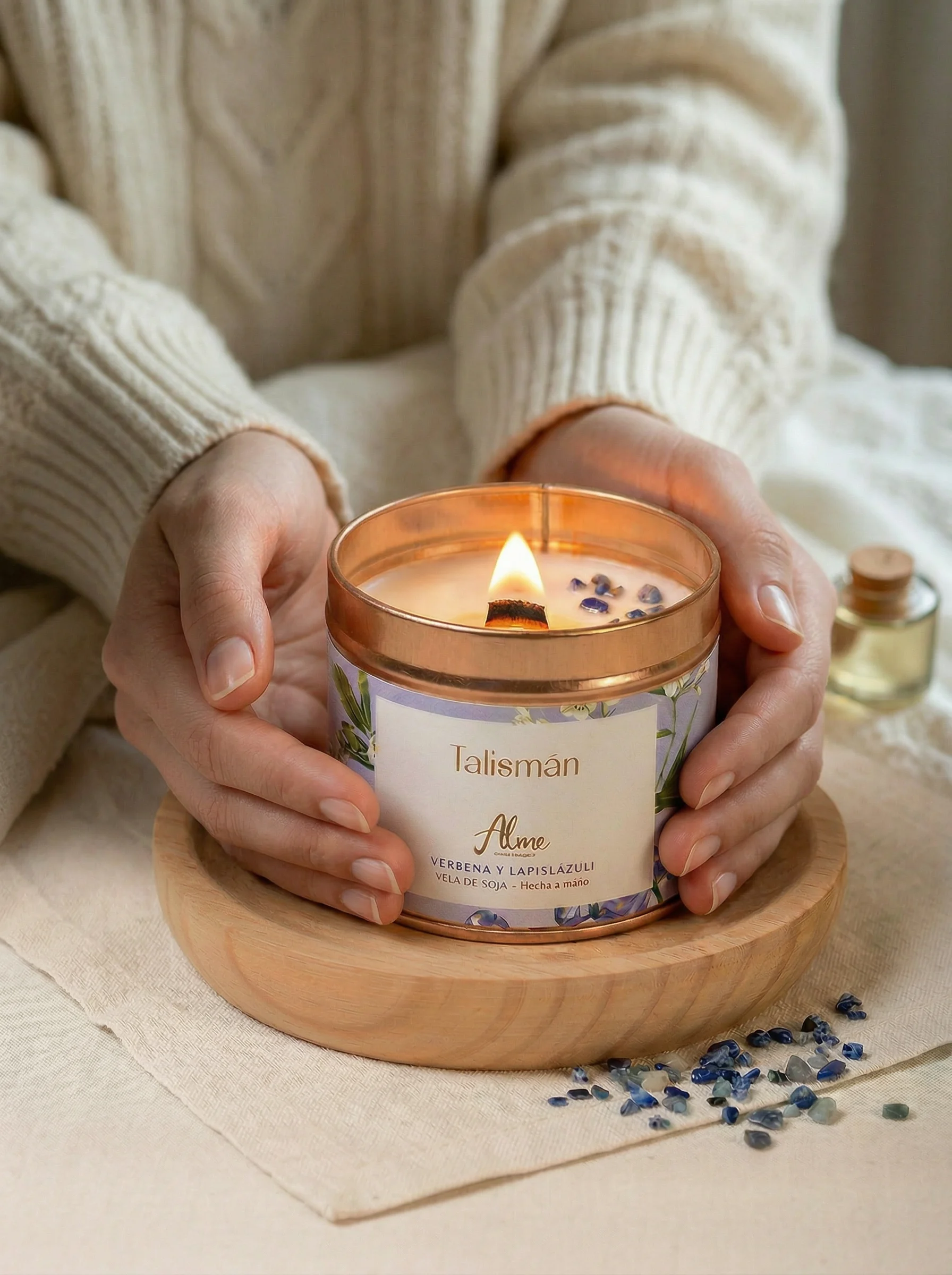 Las velas están elaboradas con cera de soja de máxima pureza, aceites esenciales y esencias aromáticas naturales. Durante su combustión no desprenden ftalatos ni parabenos.